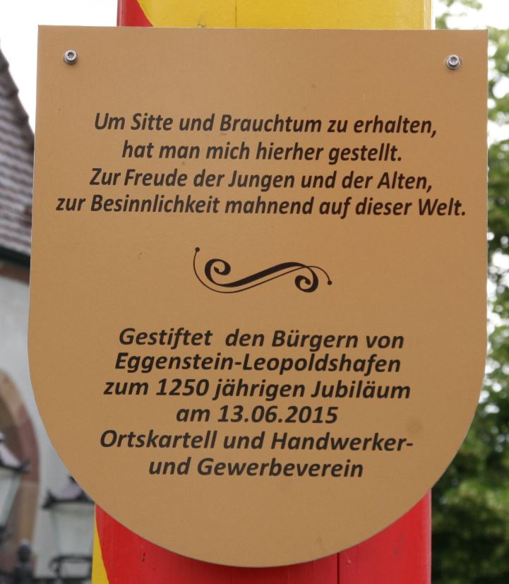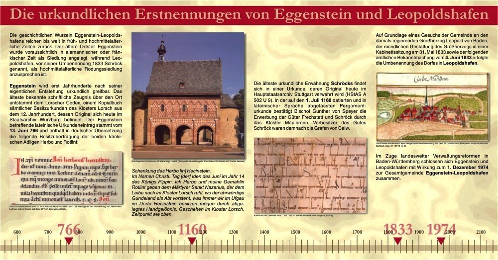 Nun sind die 1250 Jahre seit der ersten bekannten schriftlichen Erwähnung von Hecinstein (=Eggenstein) vollendet. Im Lorscher Kodex, dem „Grundbuch“ des Klosters Lorsch, steht als deutsche Übersetzung der lateinischen Eintragung vom 13. Juni 766: