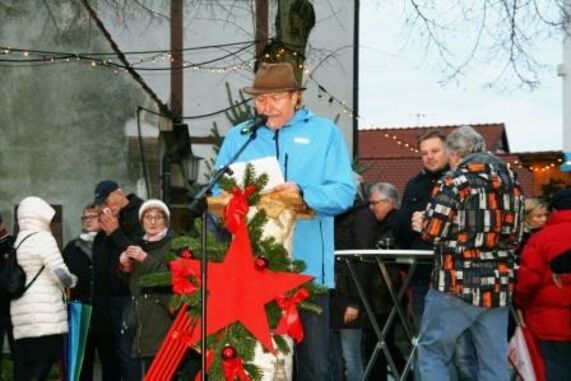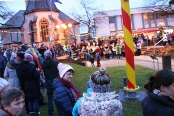Vielstimmig war das gemeinsame Adventssingen beider Ortsteile in Eggenstein-Leopoldshafen, bei welchem gleich zu Beginn Ortskartellvorsitzender Mario Schönleber gemeinsam mit dem Bürgermeister den neuen Vereins- und Gewerbebaum einweihte. Bürgermeister Stober bezeichnete ihn als ein „Symbol der Ortsgemeinschaft“, der mehr als nur ein Maibaum mit den Symbolen der traditionellen Handwerkszünfte auch die Erkennungszeichen örtlicher Institutionen trage, die in Eggenstein-Leopoldshafen das Leben und Arbeiten wesentlich prägen. Er dankte stellvertretend Mario Schönleber, der als Vorsitzender der Vereinsgemeinschaft das Groß-Projekt mit örtlichen Firmen organisiert hat und auch für die Durchführung des traditionellen Adventssingens verantwortlich zeichnet.