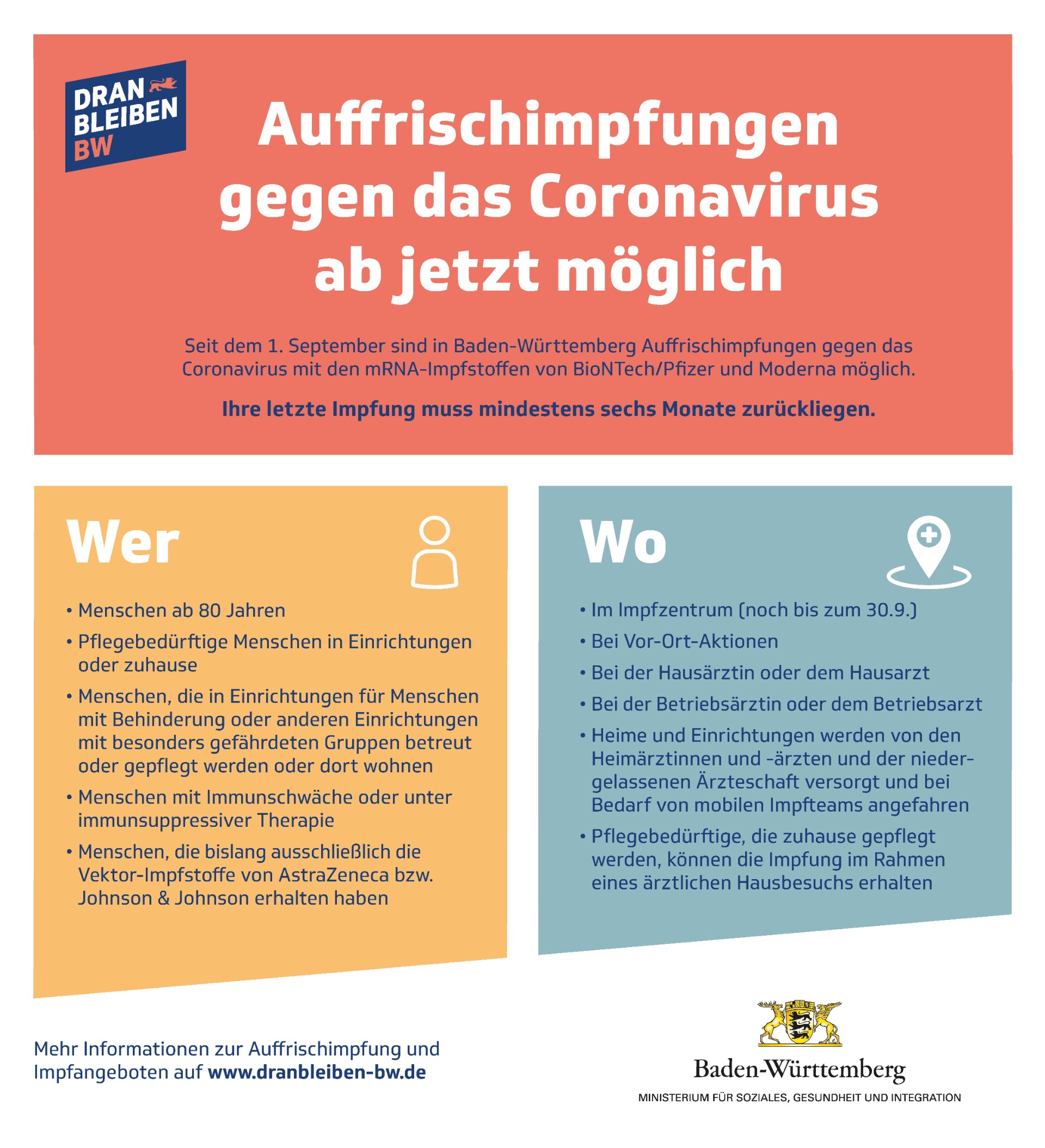 Entsprechend der Beschlüsse der Gesundheitsministerkonferenz sind Auffrischimpfungen in Baden-Württemberg ab dem 1. September möglich. Die Auffrischimpfung erfolgt für alle aktuell berechtigten Personengruppen in jedem Fall erst dann, wenn die Zweitimpfung (oder im Fall von Johnson & Johnson bzw. bei Genesenen die einmalige Impfung) mindestens sechs Monate zurückliegt.