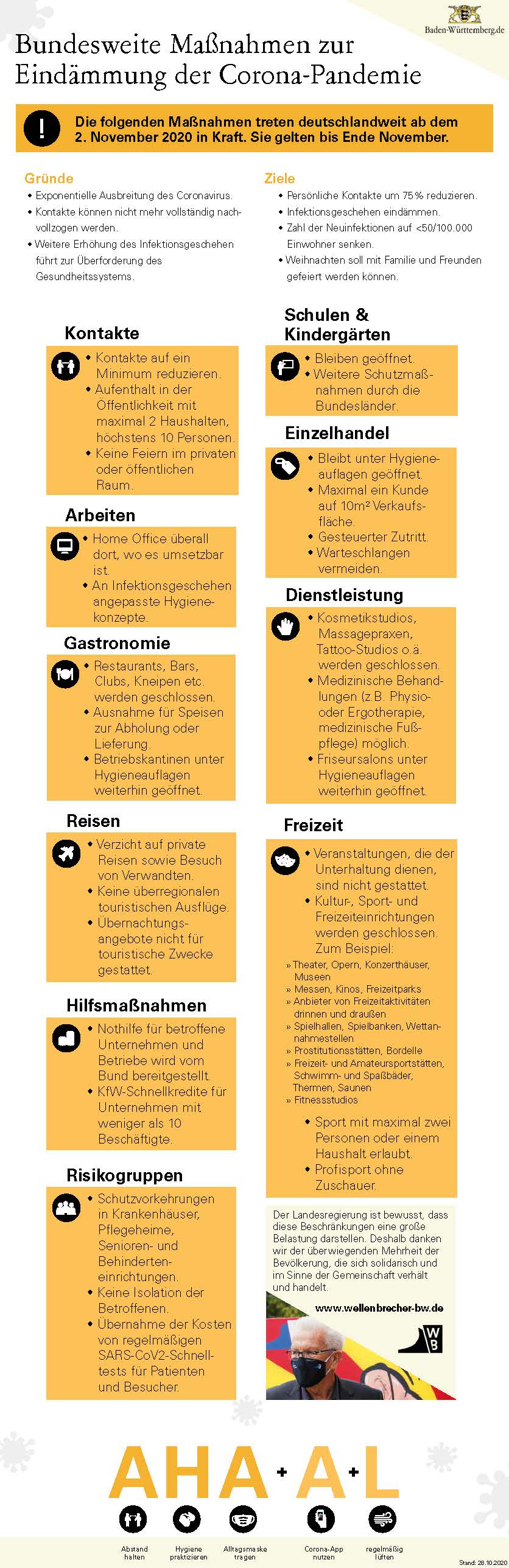 Die stetig steigenden Infektionszahlen und auch die steigende Zahl von Patienten, die intensivmedizinische Betreuung benötigen, machen weitere Einschränkungen erforderlich, damit sich das Virus nicht weiter unkontrolliert und explosionsartig verbreitet. Der Bund und die Länder haben sich am 28.10.2020 auf weitere harte Einschnitte, aber auch Hilfen für die betroffenen Gewerbe geeinigt.