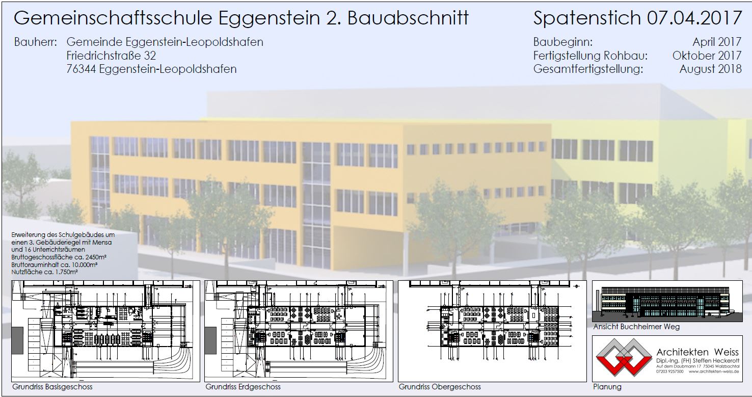 Die Vergabe der Baugewerke ist bereits zu 80% erfolgt. Nachdem der Gemeinderat das erste Ausschreibungspaket mit den Gerüst-, Erd-, Holz- und Rohbauarbeiten im März beschlossen hat, folgte im April das zweite mit den Elektro-, Sanitär-, Heizungsinstallationen, den Fassaden-, Stahlbau- und Fensterbauarbeiten. Auf einer Bruttogeschossfläche von ca. 2.450 m² entstehen im Basisgeschoss eine Mensa mit großzügiger Hoffläche sowie im Erdgeschoss und Obergeschoss 16 zusätzliche Unterrichtsräume mit ca. 1.750 m². Bis zum Oktober dieses Jahres soll der Rohbau erstellt werden. Die Fertigstellung des barrierefreien Gebäudes ist zum Beginn des neuen Schuljahrs 2018/2019 geplant.