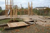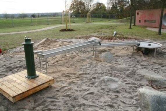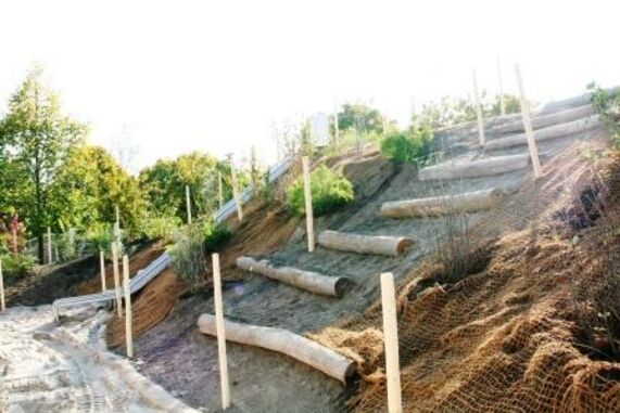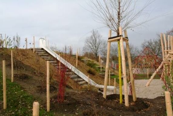 Der Hügel, unter welchem sich der Wärmespeicher befindet, wird ganzjährig gerne zum Rutschen genutzt. Das war an den vielen kahlen Stellen deutlich zu erkennen. Mittels Hangaufstiegen aus Holzstämmen und Findlingen sowie einer großen Rutsche wird das Bespielen des Hügels in Bahnen geleitet und so die Pflanzung geschont.