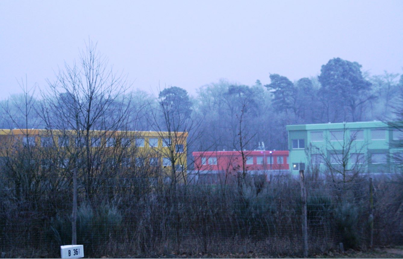 Verwaltungs- und drei baugleichen Wohncontainern (gelb, grün und blau), hatte
