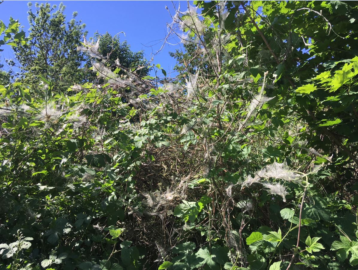 Jetzt sind viele Sträucher zu sehen, die mehr oder weniger von einem silbernen Netz eingesponnen sind. Die Gespinstmotten fressen den Strauch kahl, danach treibt er aber Ende Juni wieder neu aus. Die Gespinstmotten sind im Gegensatz zu den Eichenprozessionsspinnern harmlos. Deshalb werden sie nicht bekämpft.