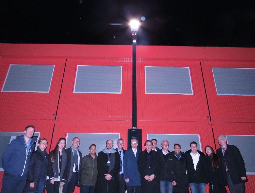 Landrat Dr. Schnaudigel mit Bürgermeister Stober und der Delegation aus Brusque, der brasilianischen Partnerstadt des Landkreises Karlsruhe. Im Rahmen der Klimapartnerschaft wurden u.a. die LED-Teststrecke und SM!GHT-Stationen der EnBW in Eggenstein-Leopoldshafen vorgestellt, auf dem Foto die Ladestation am Schröcker Tor.