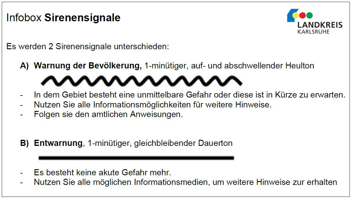 Im Landkreis Karlsruhe sind in vielen Städten und Gemeinden Sirenen installiert, insgesamt über 250 Stück. Im Bedarfsfall werden diese zentral auf Geheiß der örtlich zuständigen Ortspolizeibehörde, also die Gemeinde oder die Katastrophenschutzbehörde also das Landratsamt Karlsruhe durch die Integrierte Leitstelle für Feuerwehr, Rettungsdienst und Katastrophenschutz der Stadt- und Landkreise Karlsruhe ausgelöst.