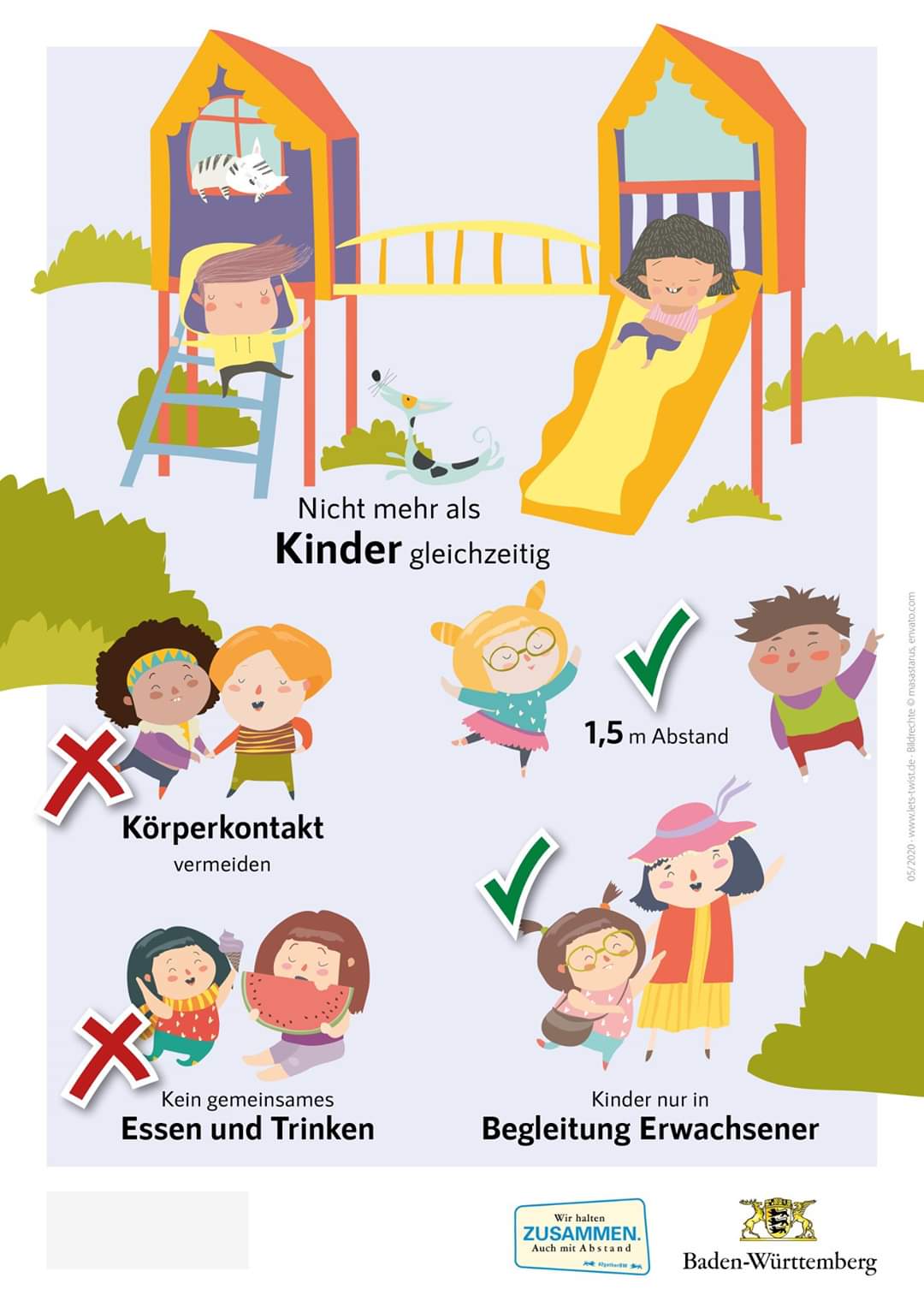 Auf den Spielplätzen hängen nebenstehende Plakate, auf denen jeweils die Anzahl der gleichzeitig zulässigen Anzahl spielender Kinder steht. Die Anzahl variiert, sie ist abhängig von der Größe des Spielgeländes.