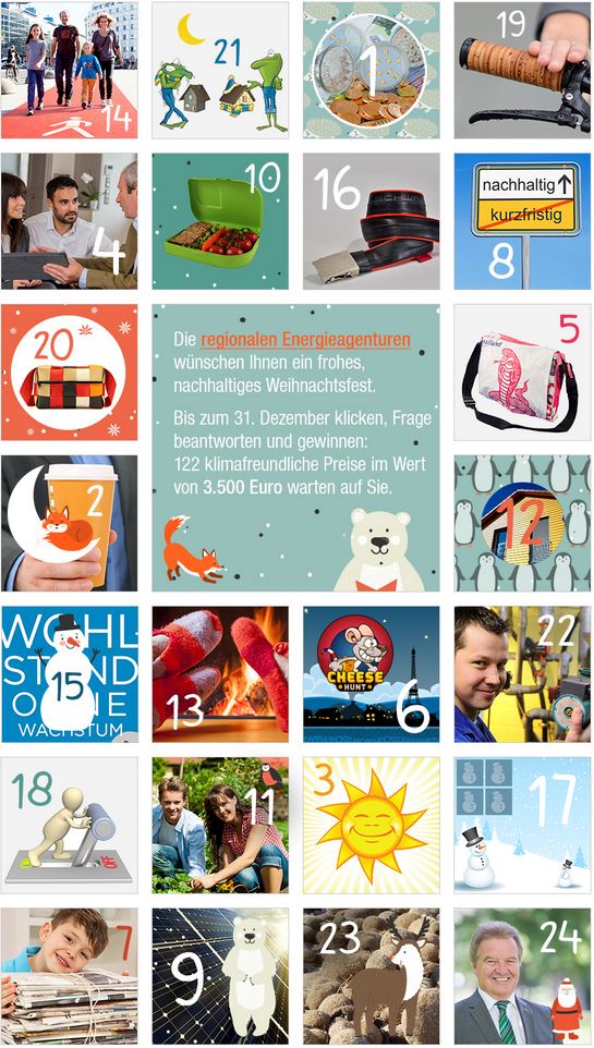 Energiesparen, Nachhaltigkeit, energetische Gebäudemodernisierung: Gutes Wissen tut Not, will man im Alltag klimafreundlich leben und dabei noch Kosten sparen. Wer täglich im Adventskalender der regionalen Energieagenturen ein Türchen öffnet, kann seine Kenntnisse testen und einen von 122 attraktiven Preisen gewinnen. Der Hauptgewinn: einen Tag lang unterwegs mit Baden-Württembergs Umweltminister Franz Untersteller MdL.