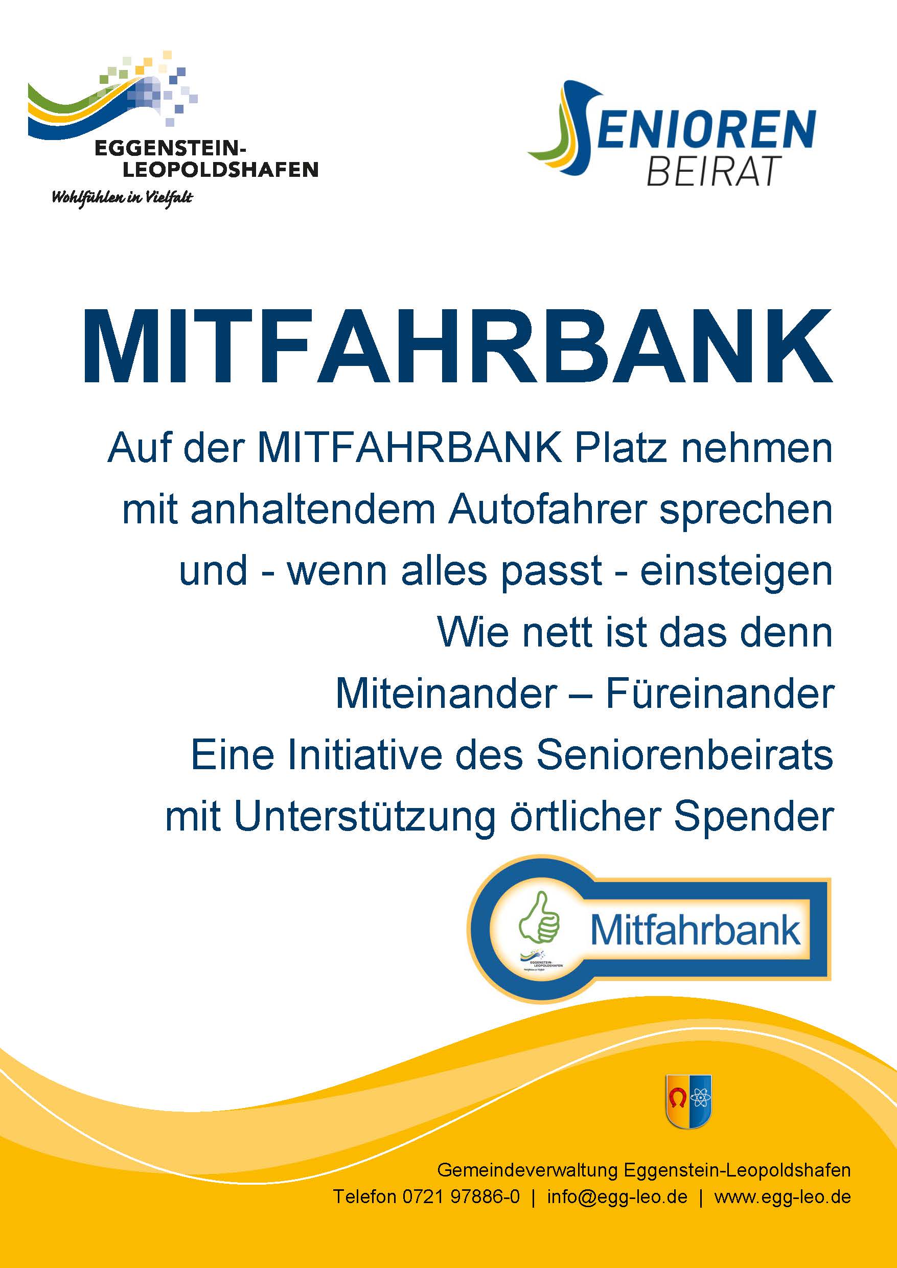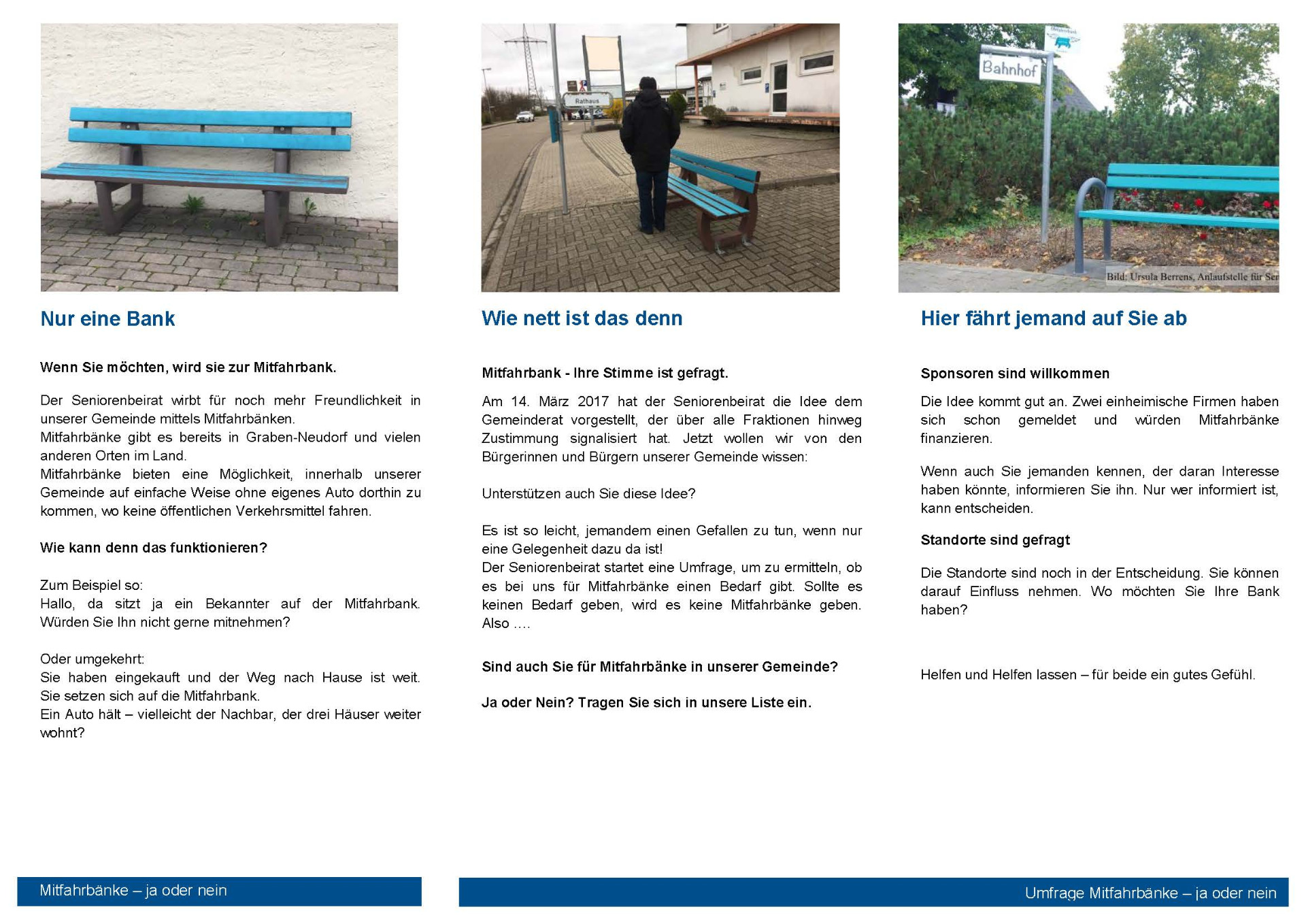 Der Realisierung des Projekts ging eine Befragung unserer Bürgerinnen und Bürger durch die Mitglieder des Seniorenbeirats voraus. Nachfolgender Flyer wurde verteilt. Fotos stammen von den Mitfahrbänken in Graben-Neudorf. Unsere haben die Signalfarbe rot.