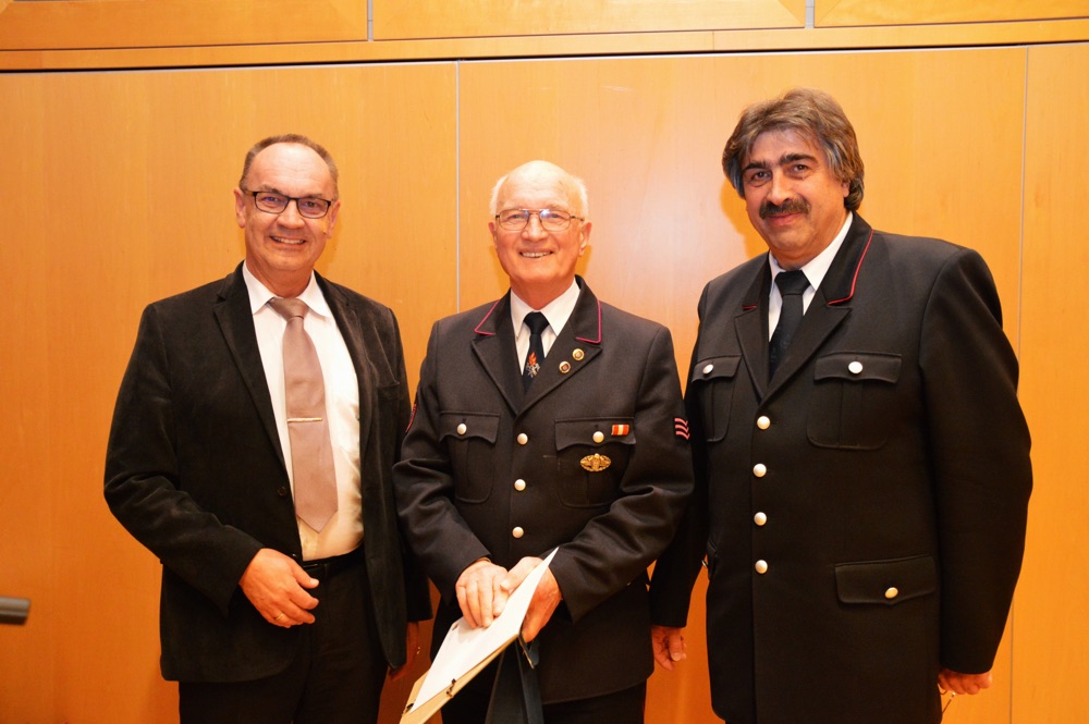 Als Höhepunkt wurde Kamerad Gerhard Schlenker auf Vorschlag der Feuerwehr durch den Gemeinderat zum neuen Ehrenmitglied der Gemeindefeuerwehr ernannt. Die Feuerwehr hatte diese besondere Ehrung beantragt, da Gerhard Schlenker nach 25 Jahren die Funktion des Kassenverwalters in jüngere Hände übergeben hat. Schlenker habe sich, so Bürgermeister Stober und Kommandant Nees in ihren Ausführungen, in dieser Zeit immer als verlässlicher und engagierter Mitstreiter im Sinne der Feuerwehr gezeigt. Dass er darüber hinaus noch parallel Mitglied im Abteilungsausschuss der Abteilung Leopoldshafen war und ist zeige seine Verbundenheit mit seiner Feuerwehr. Unzählige Veranstaltungen hat er mit vorbereitet und immer zielgerichtete Vorschläge eingebracht. Aus diesen und vielen anderen Gründen noch, habe der Feuerwehrausschuss diese Ehrung beantragt und der Gemeinderat diesem Antrag einstimmig zugestimmt.
