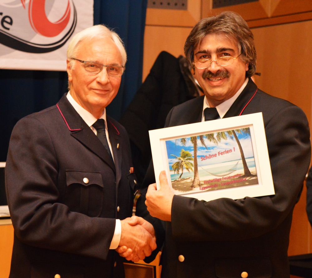 Bürgermeister Stober gratulierte im Anschluss an diese „Externen Ehrungen“ allen Genannten und überreichte ein Präsent der Gemeinde. Doch nicht nur diesen Kameradinnen und Kameraden gebühre Dank und Anerkennung. Immer wieder gerne spreche er, als oberster Dienstherr der Feuerwehr, auch Ehrungen für weitere, langjährig aktive Feuerwehrangehörige aus. So war es ihm eine besondere Freude, den Kameraden Werner Köhler aus der Abteilung Eggenstein für 65 Jahre sowie den Ehrenkommandanten Martin Hesselschwerdt für 50 Jahre Mitgliedschaft in der Feuerwehr zu ehren. Beide hätten in dieser Zeit maßgeblich an der Entwicklung ihrer Feuerwehr mitgewirkt und sie so mit zu dem gemacht, was sie heute ist. Dies verdiene Dank und Anerkennung, welche er hiermit ausspreche.