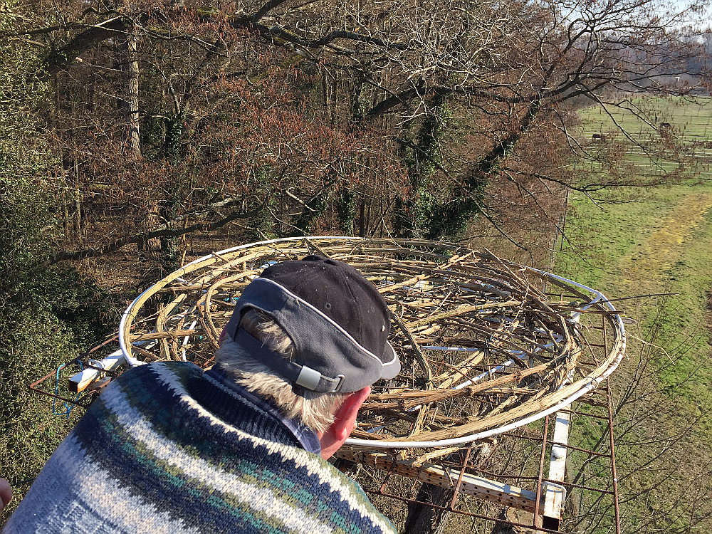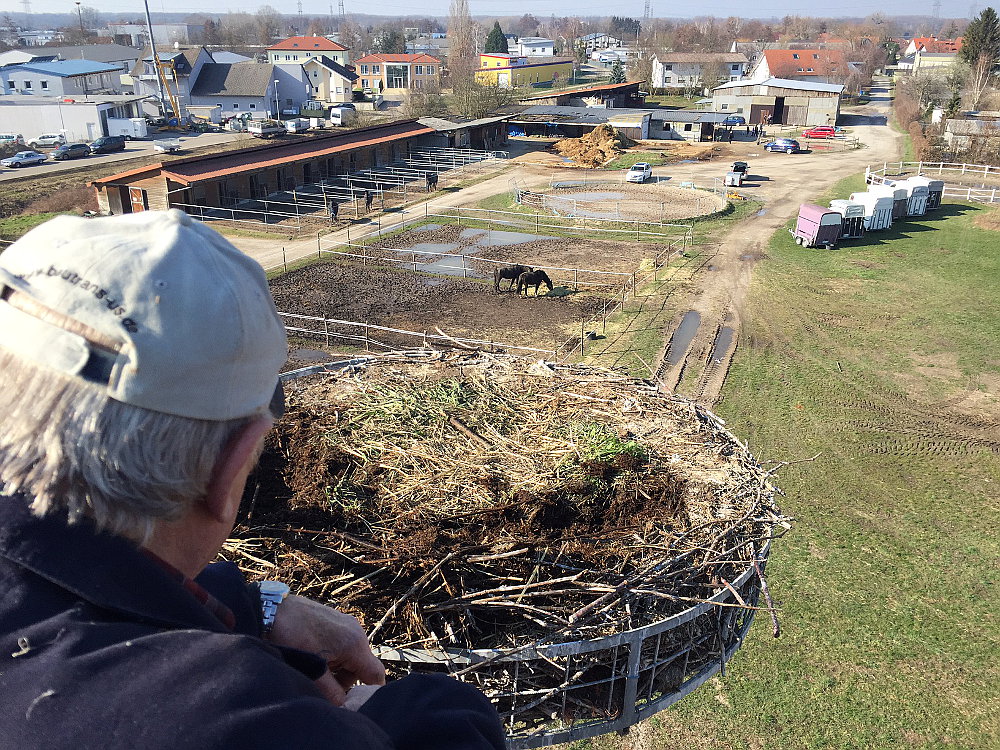 Dabei wurde darauf geachtet, dass das Wasser ablaufen kann und keine Seile oder ähnliches im Nest liegen. Das andere Nest wurde komplett frisch angelegt. Dazu wurde ein neues Gestell auf den Baum gesetzt. Die ersten Störche sind auch schon da. Sobald sie ihre Eier gelegt haben, werden die Nester noch einmal kontrolliert.
