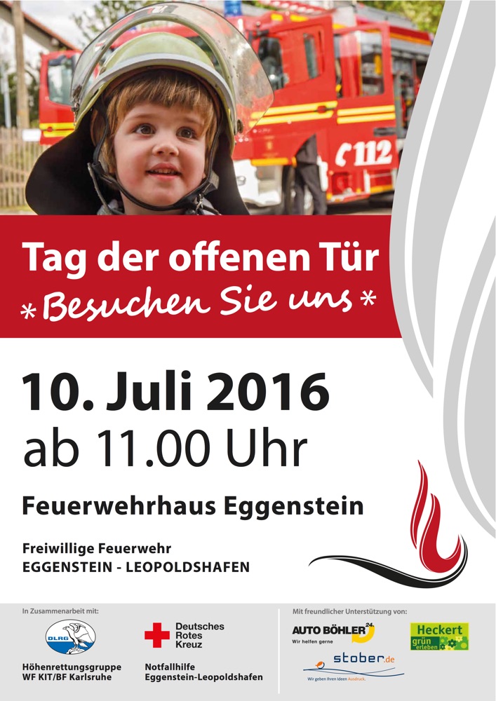 Am Sonntag, den 10. Juli 2016 findet ab 11:00 Uhr der Tag der offenen Tür der Feuerwehr Einsatzabteilung Eggenstein im und rund um das Feuerwehrhaus im Buchheimer Weg statt.