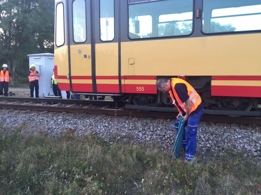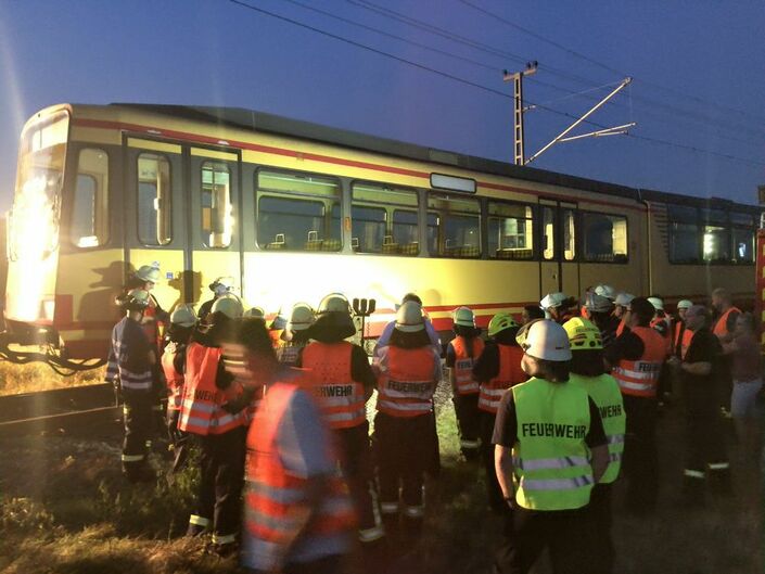 Durch die Baumaßnahmen auf der Strecke und deren Sperrung bot sich die seltene Gelegenheit, direkt an der Bahnstrecke zu üben. Dafür wurde von der AVG eine Straßenbahn auf der Strecke zum KIT bereitgestellt.