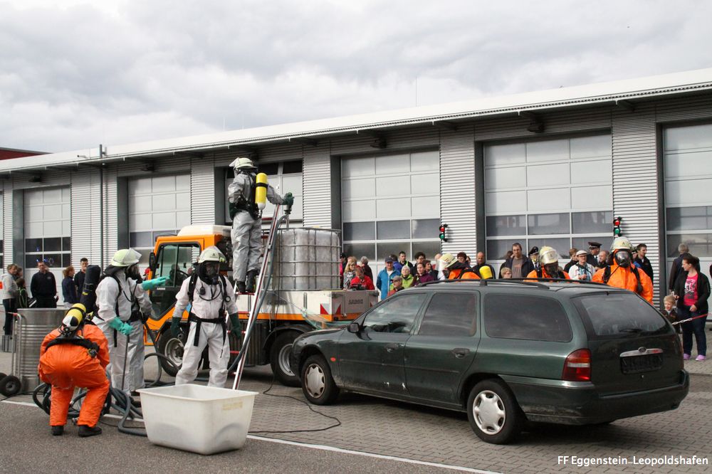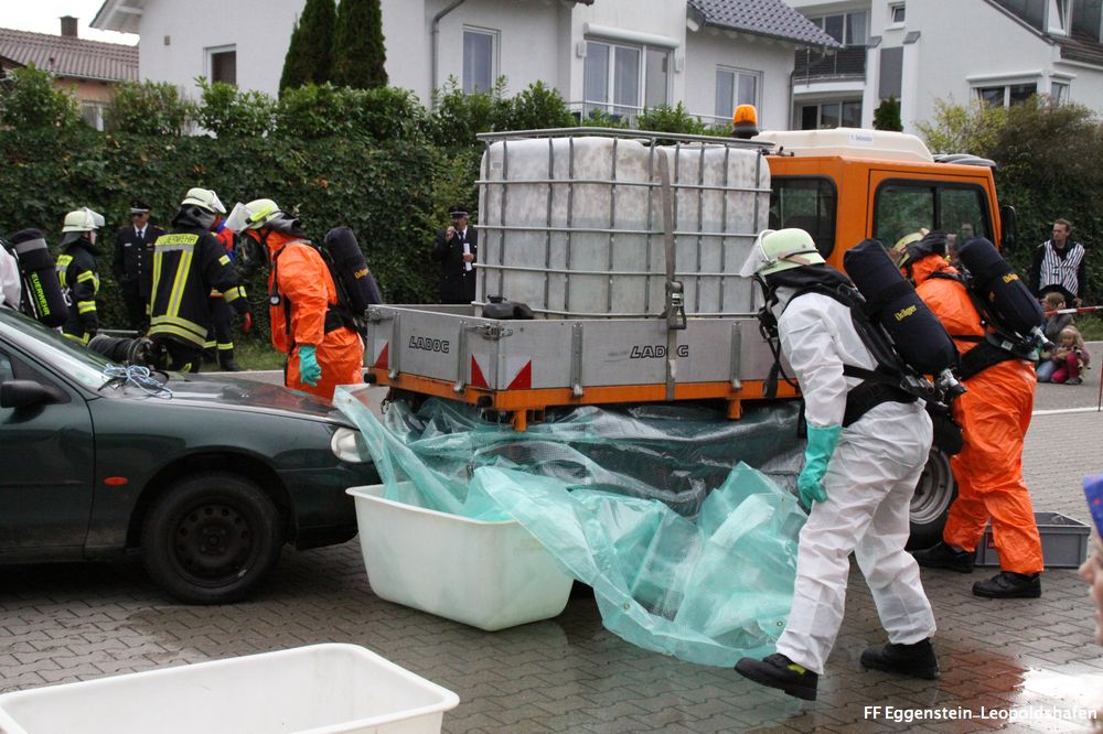 Die 25-köpfige Einsatzmannschaft der Freiwillige Feuerwehr Eggenstein-Leopoldshafen wurde zusammen mit zwei Angehörigen der Werkfeuerwehr im letzten Übungsabschnitt zu einem Verkehrsunfall mit auslaufenden Gefahrstoff von der Feuerwehr Linkenheim-Hochstetten nachalarmiert.