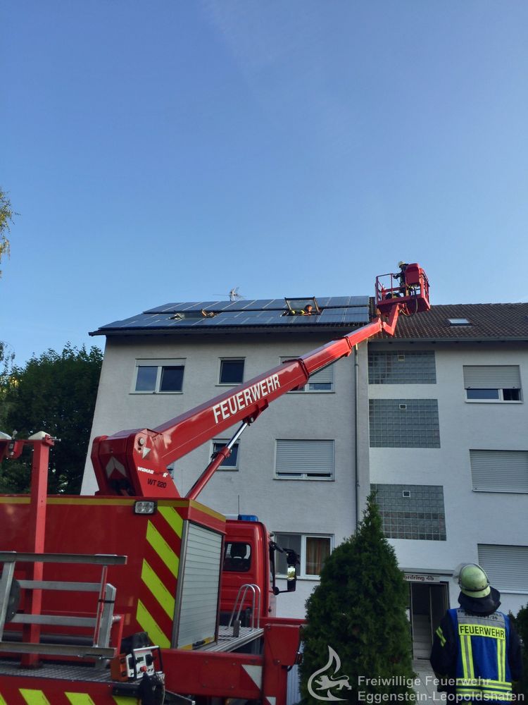 Nach Eintreffen der Feuerwehrkräfte unter Einsatzleiter Jürgen Heger an der Einsatzstelle wurde bei der Erkundung festgestellt, dass eine Katze auf dem Hausdach zwischen Ziegeln und Solarpaneel stecken geblieben ist.