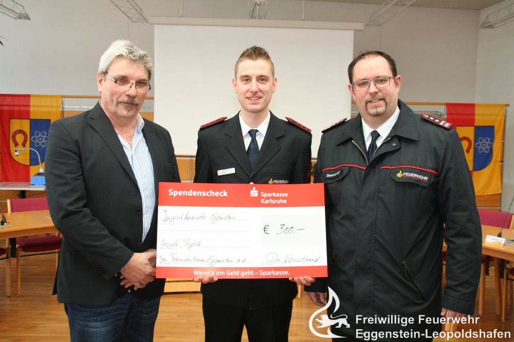 Am Donnerstag den 22.02.2018 wurde der Jugendfeuerwehr Eggenstein-Leopoldshafen ein Scheck in Höhe von 300€ von der Freundeskreis Eggenstein e.V. übergeben. Kommandant Dominik Wolf und der Stv. Jugendwart Jens Bogner bedankten sich und freuten sich über die Spende, die für die Ausstattung der Kinder- und Jugendarbeit verwendet wird.