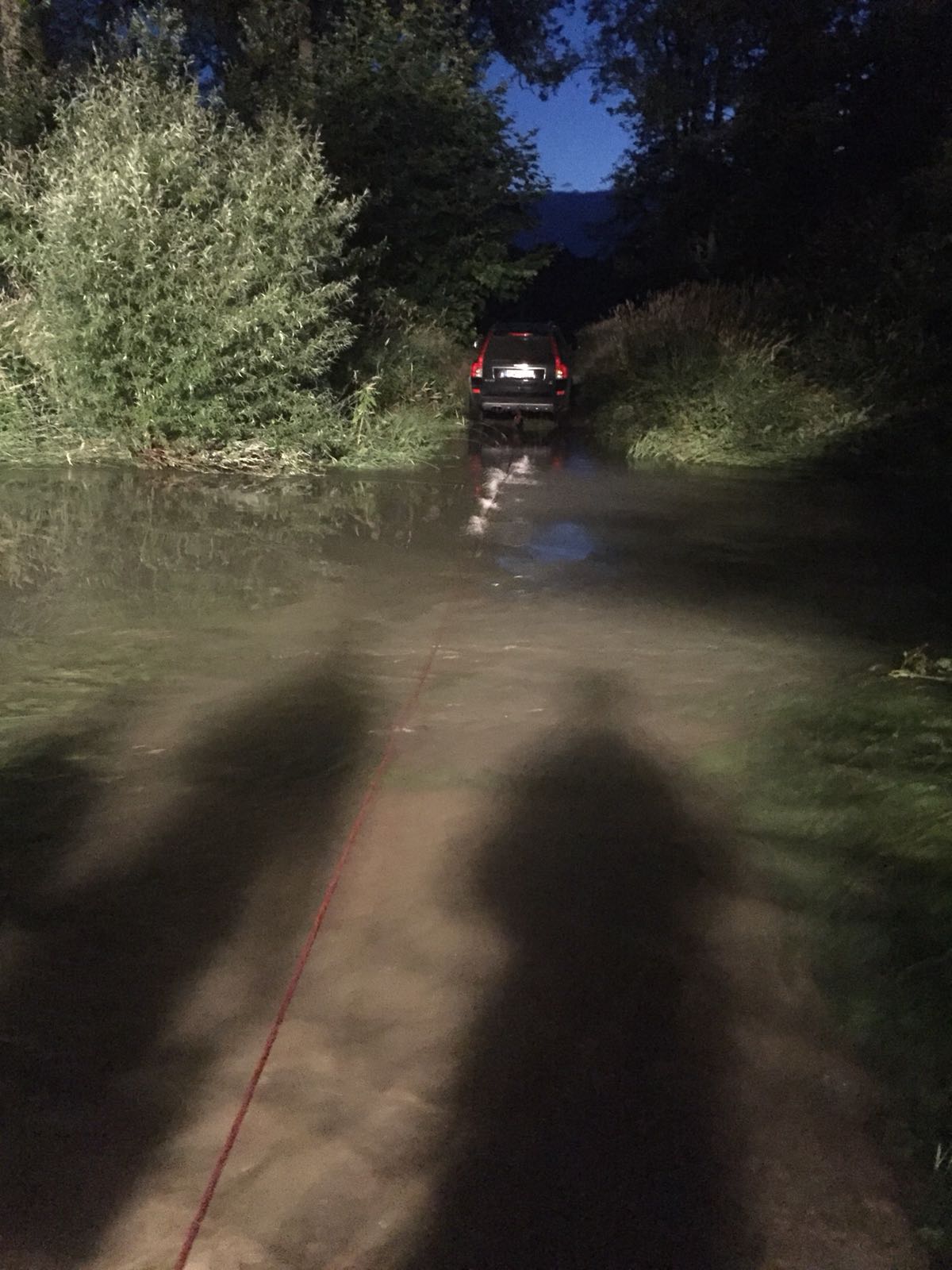 Nach Eintreffen der ersten Einsatzkräfte unter Kommandant und Einsatzleiter Dominik Wolf stellte sich heraus, dass ein Fahrzeug nach einer Durchfahrt durch eine überflutete Senke nicht mehr fahrbereit und zwei Personen somit der Rückweg auf Grund des Hochwassers versperrt war. Auf Grund der starken Strömung war eine Rettung mit Boot der Freiwilligen Feuerwehr nicht möglich, so dass die Personen nach Rücksprache mit der Wasserschutzpolizei mit einem Boot der Polizei gerettet wurden.