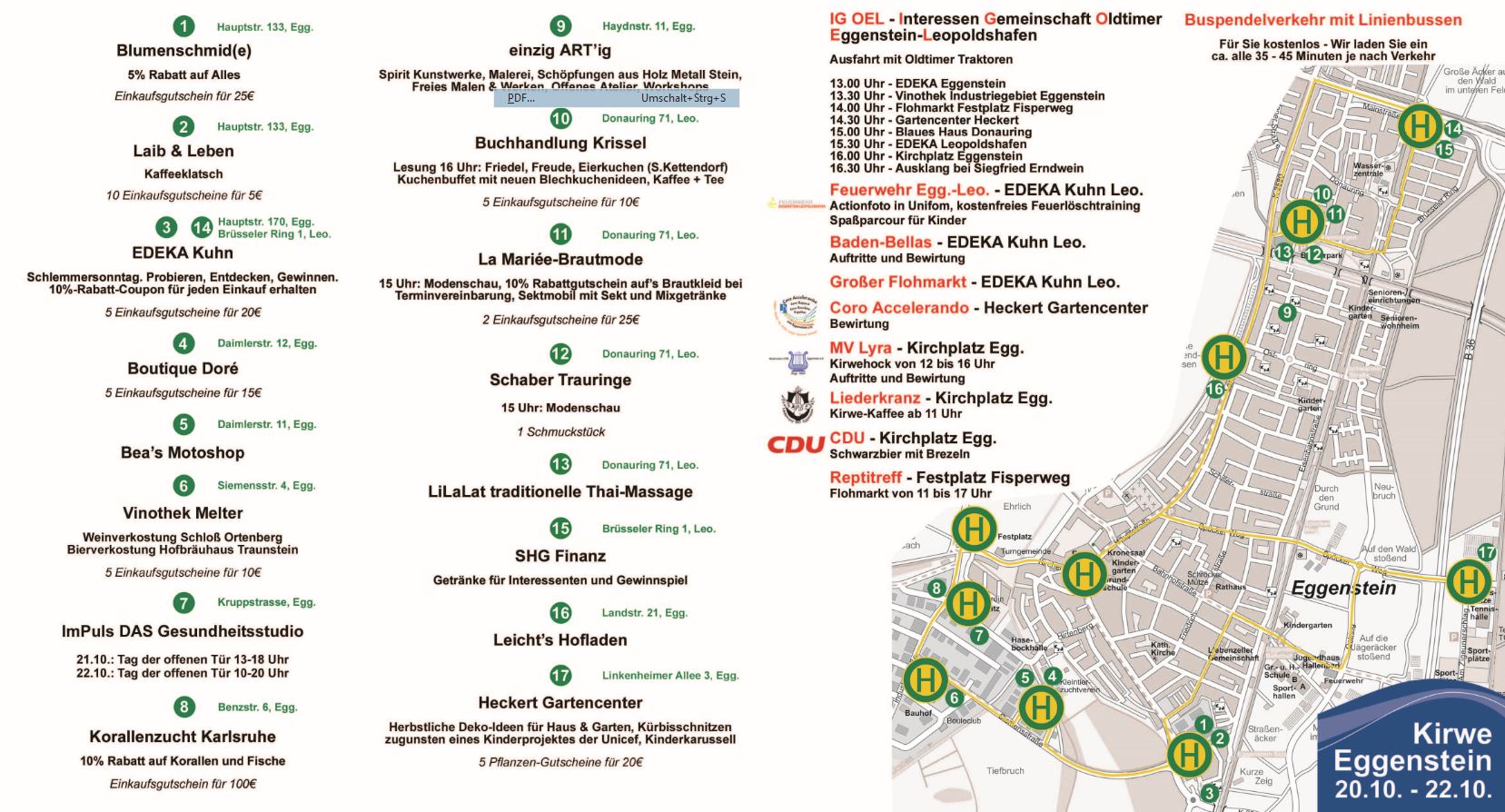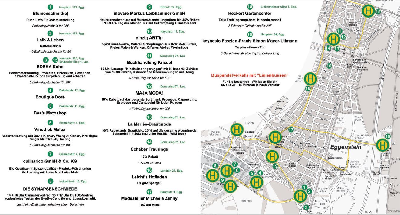 Sonntage mit offenen Ladentüren sind eine wunderbare Gelegenheit für einen Bummel durch die Geschäfte, deren Inhaber sich immer viel einfallen lassen, um die Besucher zu begeistern. Sie finden in Eggenstein-Leopoldshafen zusammen mit dem umfangreichen Angebot örtlicher Vereine und Gruppen beim Frühlings- und Herbstmarkt statt.