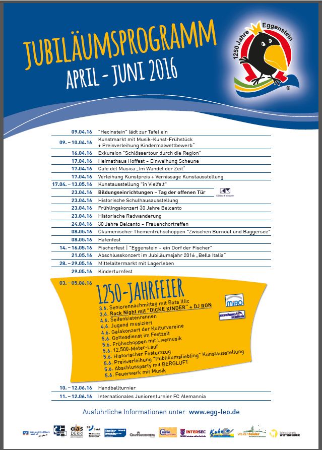 Alle Termine, die unter dem Jubiläumsmotto stehen, wurden schlagwortartig in verschiedene Veranstaltungskalender, Termindatenbanken und in die Festschrift aufgenommen. Ein ausführliches Programmheft wurde Juni 2015 an alle Haushalte in Eggenstein-Leopoldshafen kostenlos verteilt.